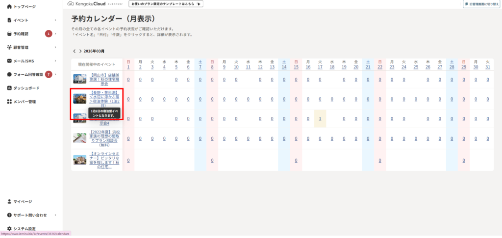 - イベントの予約状況をカレンダーで確認します。