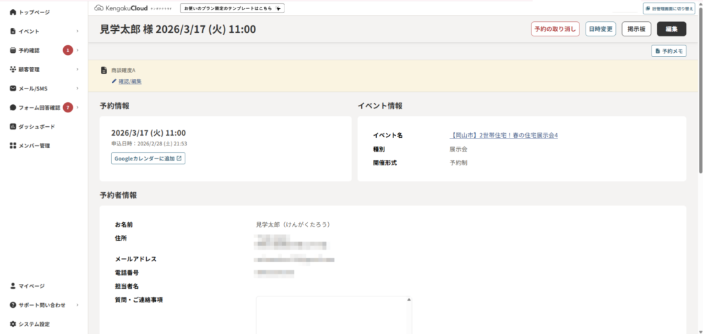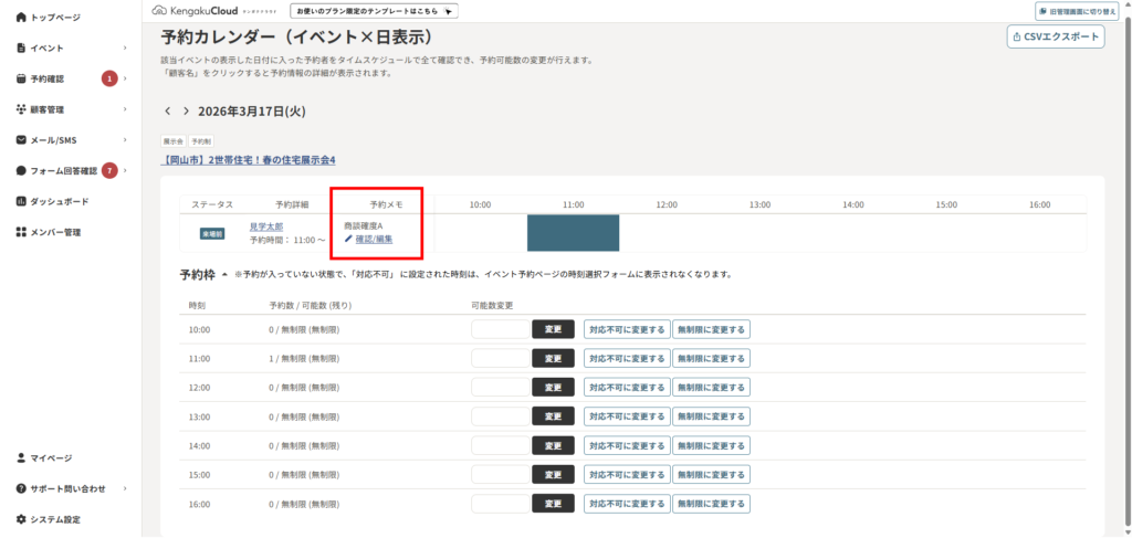 8. 予約メモの[確認/編集]をクリックすると予約メモが編集できます。